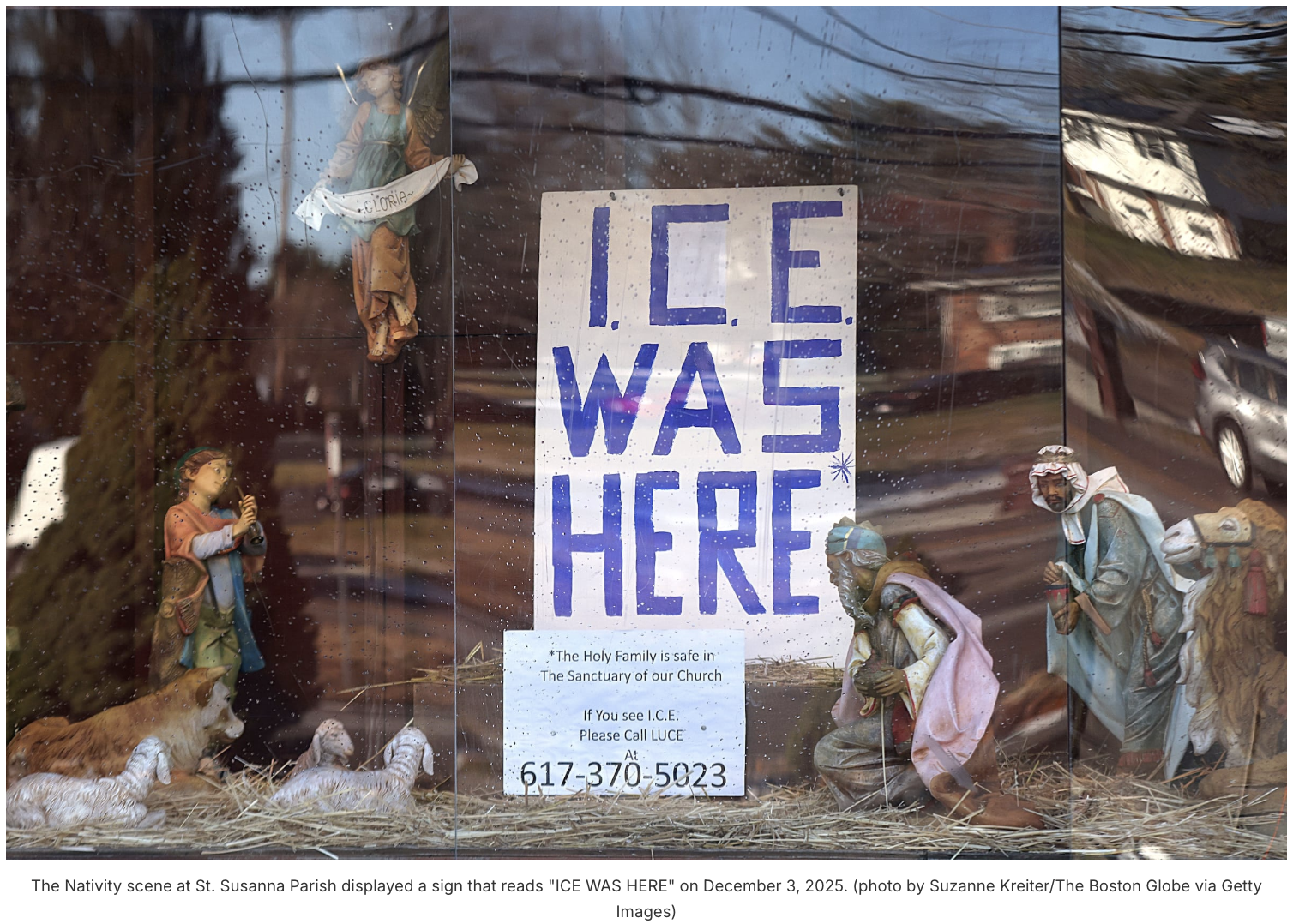 This past Friday, December 5, the Archdiocese of Boston asked St. Susanna Parish in Dedham, Massachusetts, to remove its nativity scene. The crèche features the shepherds and the Wise Men, but no Holy Family — no Jesus, Mary, or Joseph. In their place is a sign that reads: “ICE WAS HERE.”