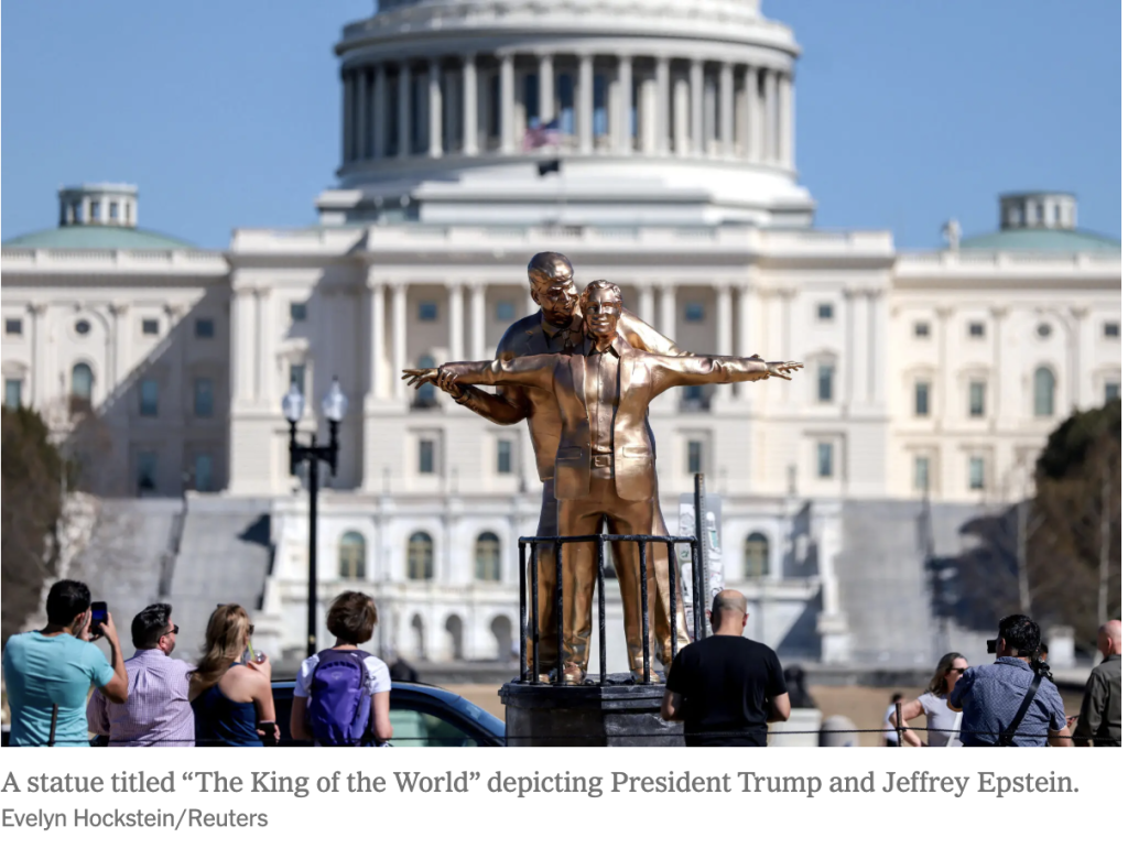 A Statue of Trump and Epstein Re-enacting ‘Titanic’ Pose Appears on National Mall, by Ashley Ahn, The New York Times, March 12, 2026