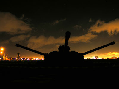 I knew it would be seen immediately because of the huge spotlights (several 2 Kilowatt lights) we used to light it at night. The light was magenta. Combined with the color of the tank, it was almost fluorescent. I also added stroboscopes inside the barrels for the shooting effect and a huge searchlight to look out for enemy planes.