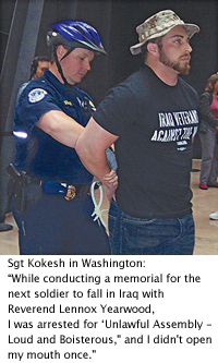 Kokesh does not pretend to be an angel. He brought home a pistol from Iraq; he says he bought it from a policeman there, but it was in violation of rules and it prevented him from returning on a second Iraq tour that he wanted. Though he had risen to the rank of sergeant after 3½ years in the Reserves, he was demoted to corporal and soon thereafter discharged honorably – with a re-enlistment code that basically said, “you can’t re-enlist.”