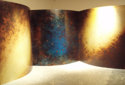 Annabelle Moreau’s new installation piece Formation 1 – Allegoria is comprised of three large scale curved aluminium panels, placed in a darkened space and spot lit. The surfaces of these panels are painted in oil. Rough and delicate marks open up a painterly illusion of space. The panels as objects re-shape the gallery and enclose the viewer, allowing an interaction between actual and imaginary spatial experience.