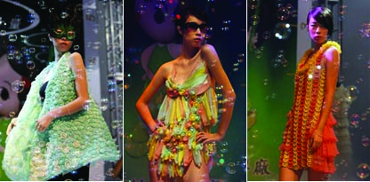Models fought through extravagant soap bubble special effects to show off tight-fitting wedding gowns, scaly-looking evening dresses, outrageous bikinis and other garments made entirely of condoms, inflated or otherwise.