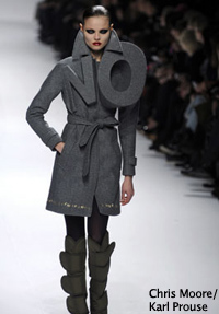 The gold staples used in place of sewing on many garments were interesting. But apparently, this had to do with a protest against fast fashion, which is like a protest against fashionable clothes for the poor and middle class “” just a little too Marie-Antoinette for me. I share the fashion industry”s concern that valued artisans are losing jobs to poorly paid Chinese factory workers, but fast fashion isn”t the problem: economics, and environmental and labor laws is.