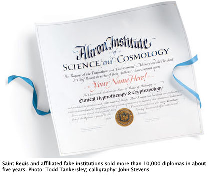 Still, Gollin”s curiosity was piqued, so he decided to look up Parkwood University online. At first glance, the Web site resembled that of any liberal arts college, complete with links for information on student services, academics, and faculty. But with some Googling, Gollin discovered that the course catalog for Parkwood had been copied wholesale from the University of Central Florida”s Web site. He also found that the greeting from Parkwood”s supposed president appeared on the sites of five other schools, all of them apparent shams.