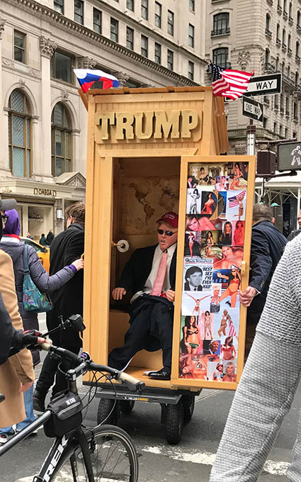 As the parade enters Washington Square Park, the festivities will begin. All food concessions will be provided by sh**hole Third World countries. As long as supplies last, the H&M apparel company will hand out their insensitive “Coolest Monkey in the Jungle” hoodies. Megyn Kelly and Jane Fonda look-alikes will have a free-for-all slap-off. USA Gymnastics will be offering free gynecological exams provided by a Larry Nassar look-alike. A Princess Michael of Kent look-alike will hawk racially offensive jewelry, and UCLA basketball players will hawk sunglasses shoplifted in China. All parade revelers are invited to experience humiliation on the United Airlines Plane Float, where they will be dragged kicking and screaming down the aisle and thrown out the door. A Kathy Griffin look-alike will auction severed Trump heads and a Michael Phelps look-alike will swim with sharks in the Washington Square Park fountain. Free Covfefe will be served to all by White House staff look-alikes.