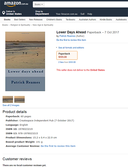 The impersonator priced the book at $555 and it was posted to multiple Amazon sites in different countries. The book — which as been removed from most Amazon country pages as of a few days ago – is titled “Lower Days Ahead,” and was published on Oct 7, 2017.