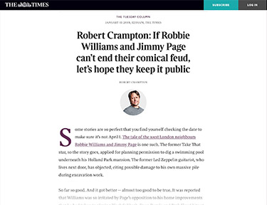 The next day I was contacted numerous times by Harry Shukman, a London Times journalist, wanting to know if I was responsible for a letter sent to the Kensington and Chelsea borough in the UK purporting that singer songwriter Robbie Williams (the former Take That star) has been mocking Jimmy Page (of Led Zeppelin fame) with ridiculous stunts because Page has been trying for five years to protect his historic mansion from potential damage that could be caused by Williams’ proposed construction of an underground pool next door.