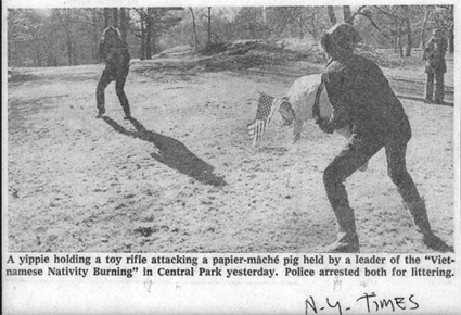 Jim was with me for my Vietnamese Christmas Nativity Burning in 1968. Although I had attained a Film Permit for the event in Central Park, the police refused to honor it and arrested numerous “actor” friends including Sam Reeves (left) and Jim Walton (right) for “littering”.