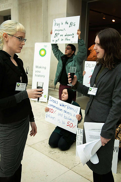Performers dressed as BP employees sipped oil-contaminated champagne, and protesters displayed facts about BP’s exploitation of Iraqi resources.