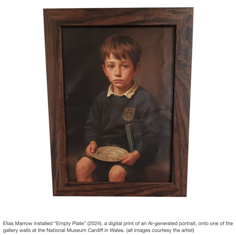 The print emulates an oil portrait of a nondescript young boy in a school uniform, holding a bare plate on his lap with a dour expression. Per the artist’s website, “It is unclear whether [the boy] waits to be fed, punished, or simply forgotten.” While the subject appears to have the correct number of fingers, other aspects of the painting, including the jumbled alphabet on his uniform logo and the overall yellowish tinge to the work, are undeniable evidence of generative AI — though Marrow’s accompanying wall text does not mention it. Read the whole article here.